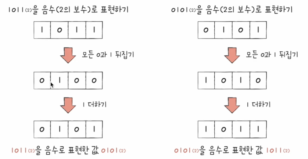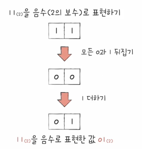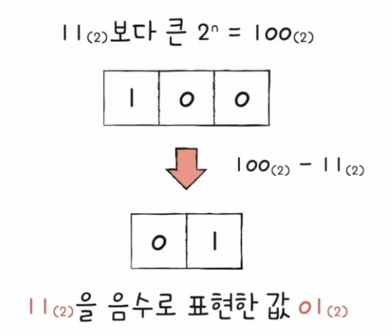 - 어떤 수를 그보다 큰 2^n 에서 뺀 값(= 모든 0과 1을 뒤집고 1 더한 값)