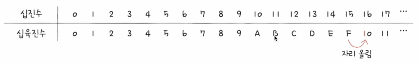 그래서 컴퓨터의 데이터를 표현할 때 십육진법도 많이 사용한다. 수가 15를 넘어가는 시점에 자리올림을 한다.