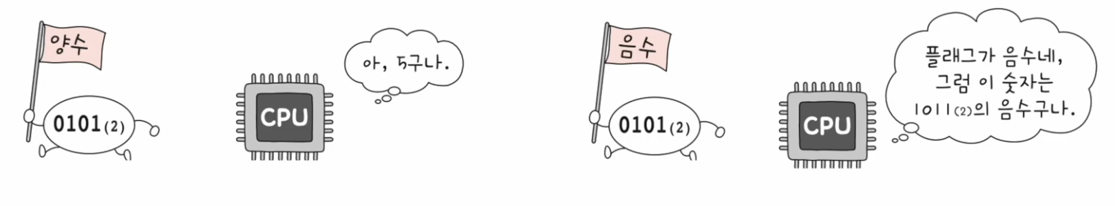 " -1011(2) 를 표현하기 위한 0101(2)과 십진수 5를 표현하기 위한 0101(2)는 똑같이 생겼는데 어떻게 구분할까?"