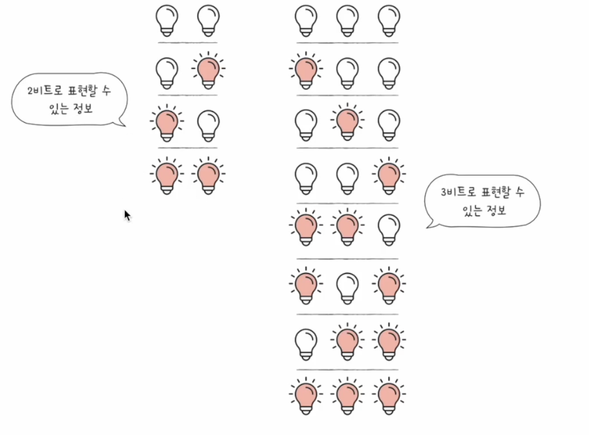 - n비트로 2^n가지의 정보를 표현 가능하다.