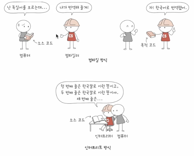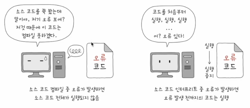 소스 코드를 한 줄씩 실행해주는 언어. (컴파일을 할 수 있는지 없는지 확인)