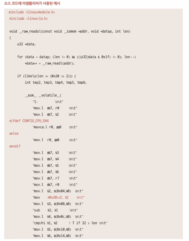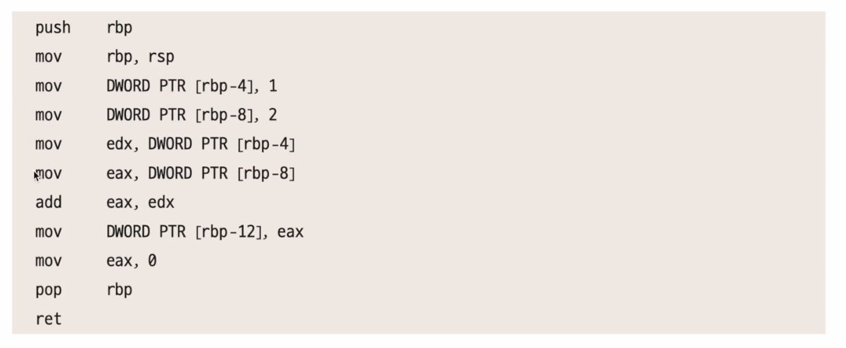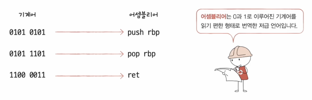 사람 입장에서 이것을 해석하는 것은 알기가 너무 어렵다. 이것을 조금 알아보기 쉬운 저급 언어로 변환한 것이 어셈블리어이다.