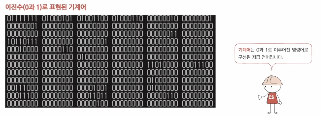 0과 1로 이루어진 언어 = 명령어로 이루어진 언어이다. 위에 0과 1이 명령어라고 생각하면 된다.