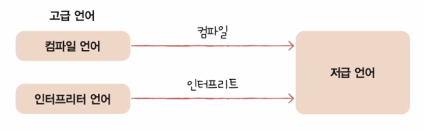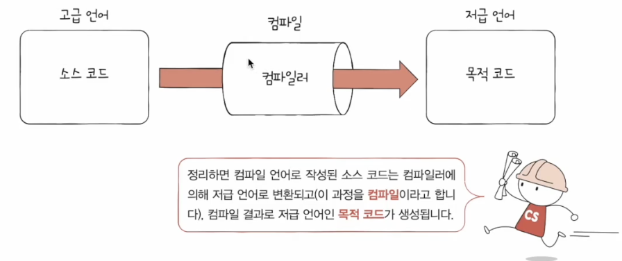 고급언어가 컴파일러라는 특수프로그램에 의해 컴파일이 된다. 그렇게 되면 명령어로 이루어진 저급 언어로 변환이 된다.