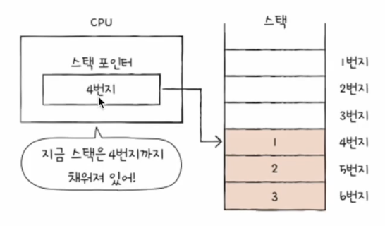 위 그림과 같이 4번지까지 스택이 차있으면 스택 포인터에는 4번지 주소값이 저장된다.