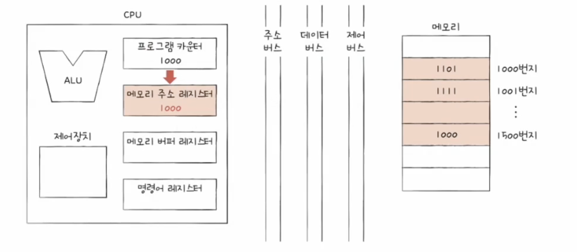 그렇게 되면 메모리는 1000번지에 저장된 값을 메모리 버퍼 레지스터로 데이터 버스를 통해 전달한다.