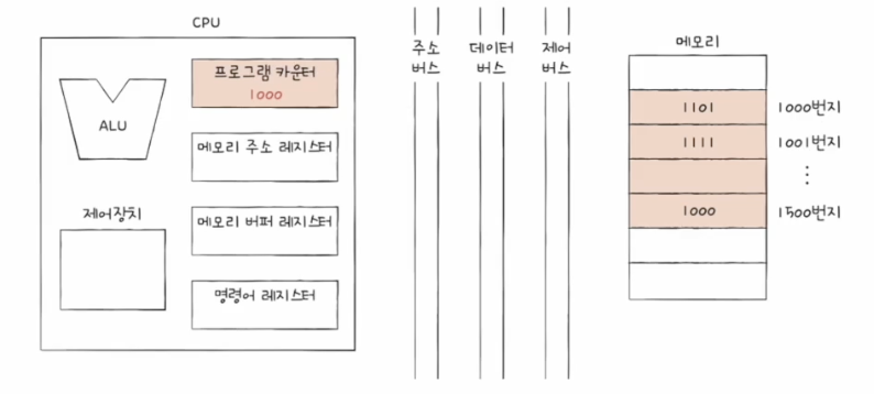 위 그림처럼 CPU가 처리하고자 하는 프로그램이 1000번지 부터 ~ 1500번지까지 있다고 가정해보자 또 처음부터 프로그램을 실행한다고 가정했을때 프로그램 카운터에는 1000번지가 저장될 것이다.