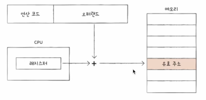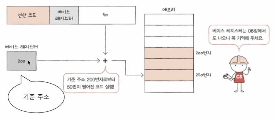 - 베이스 레지스터 주소 지정 방식 : 오퍼랜드 필드의 값(변위)과 베이스 레지스터의 값을 더하여 유효 주소 얻기