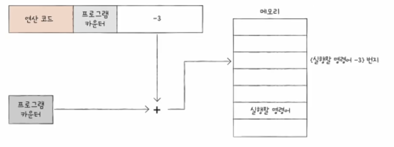 위 그림은 다음으로 읽을 메모리 주소에서 3번째 전의 명령어를 실행해라 라는 명령어를 실행하려면 위 그림과 같이 표현할 수 있다.