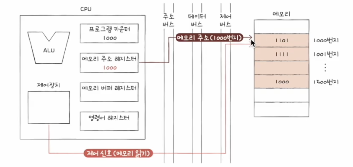 메모리 제어 신호를 통해 몇번지 메모리를 읽고 싶은지 메모리에게 쏴준다.