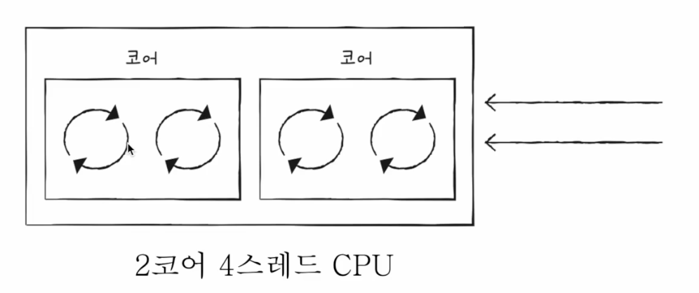 - 하드웨어 스레드(=논리 프로세서) : 하나의 코어가 동시에 처리하는 명령어 단위