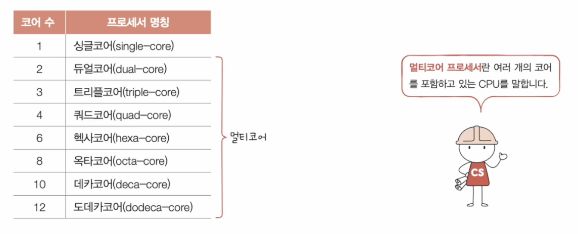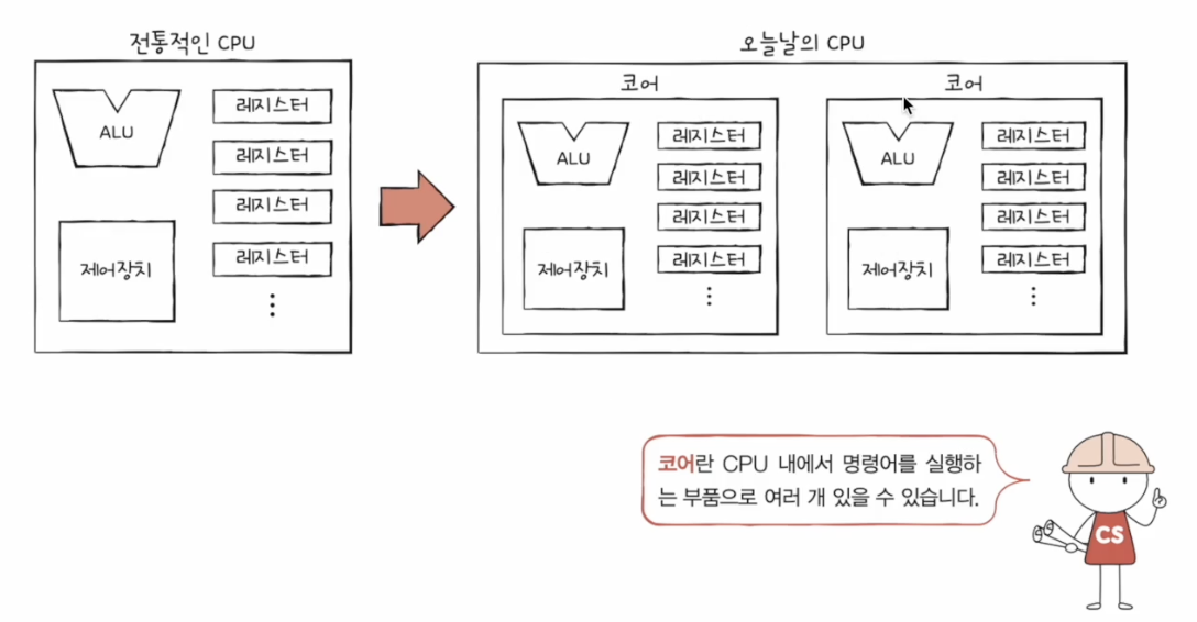 코어를 이해하기 위해서는 현대적인 관점에서 CPU라는 용어를 재해석 해야 한다. 전통적으로 명령어를 실행하는 부품은 원칙적으로 하나만 존재했다. 그러나 오늘날에는 CPU에는 명령어를 실행하는 부품이 여러개 존재한다.