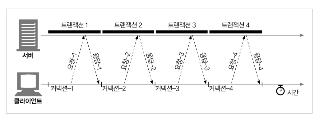 - 각 트랜잭션마다 새로운 커넥션을 맺고 끊기 때문에 시간과 대역폭이 소요된다.