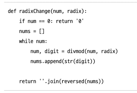 num, digit = divmod(num, radix) # num에는 몫이, digit에는 나머지가 담기게 된다