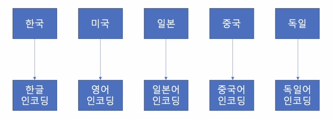 언어별로 인코딩을 국가마다 하게 되면 다국어를 지원하는 프로그램을 개발할 때엔 언어별 인코딩 방식을 모두 이해해야 한다.
