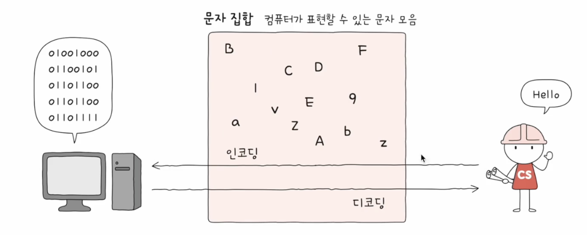 - 디코딩 (decoding) : 0과 1로 표현된 문자 코드로 문자를 변환하는 과정