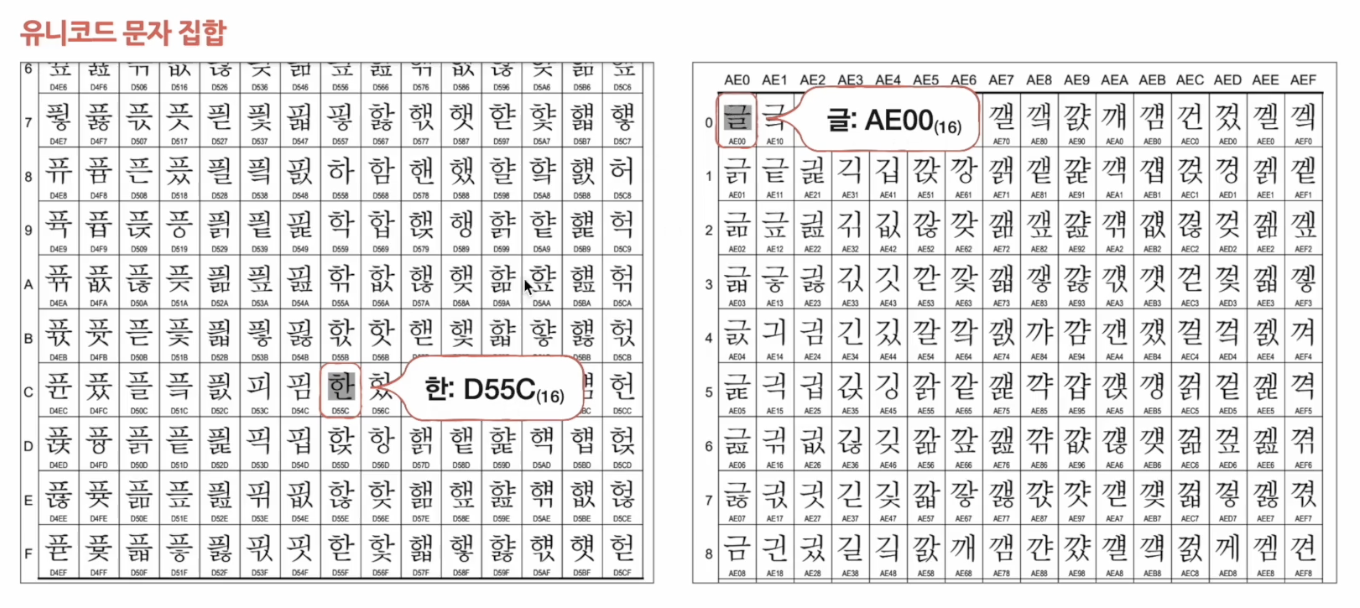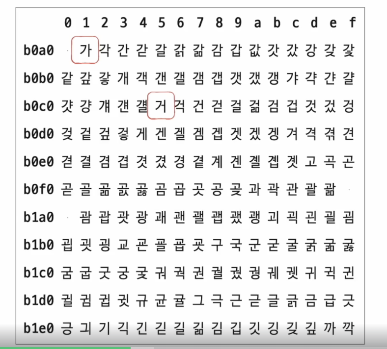 - 글자 하나 하나에 2바이트 크기의 코드를 부여(2바이트 == 16비트 == 4자리 십육진수로 표현)