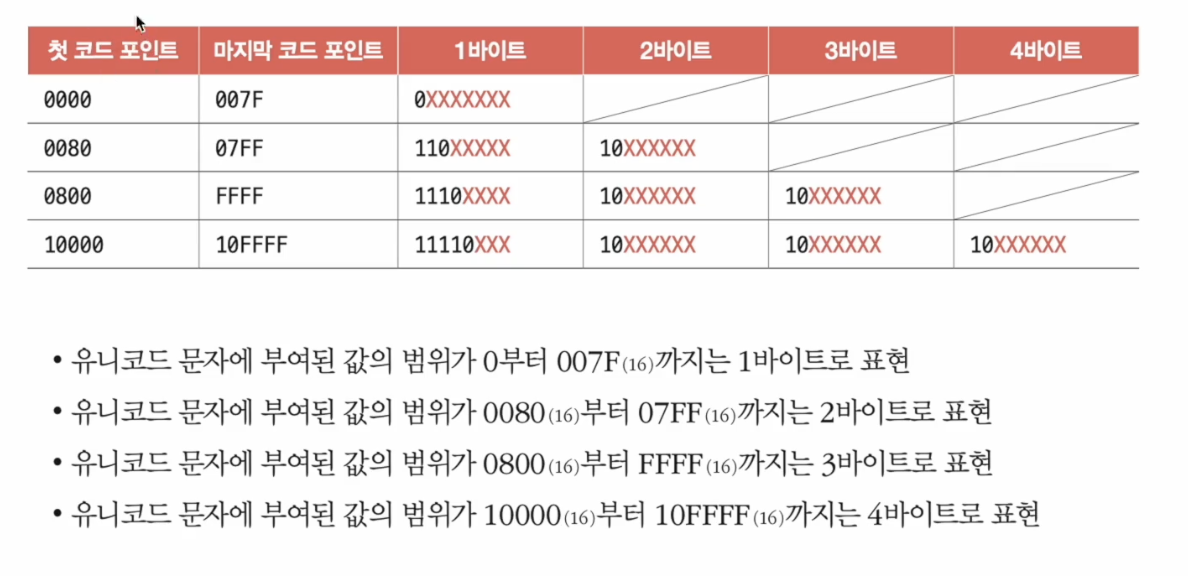 - 인코딩 결과가 몇 바이트가 될지는 유니코드에 부여된 값에 따라 다름