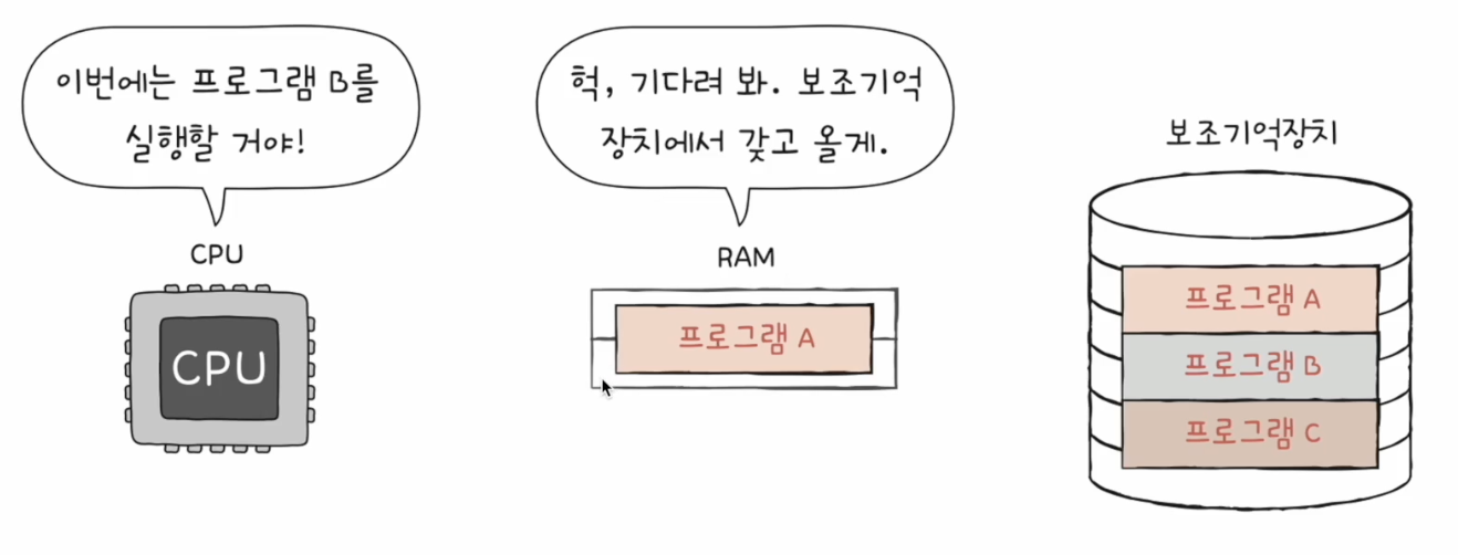 위 그림과 같이 RAM이 작아서 프로그램 3개중 하나만 저장가능하다고 가정해보자 CPU가 한번에 여러가지 연산을 할 수 없게된다.