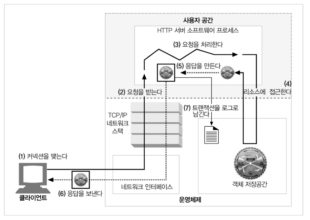 - 요청을 처리한다 -- 요청 메시지를 해석하고 행동을 취한다.