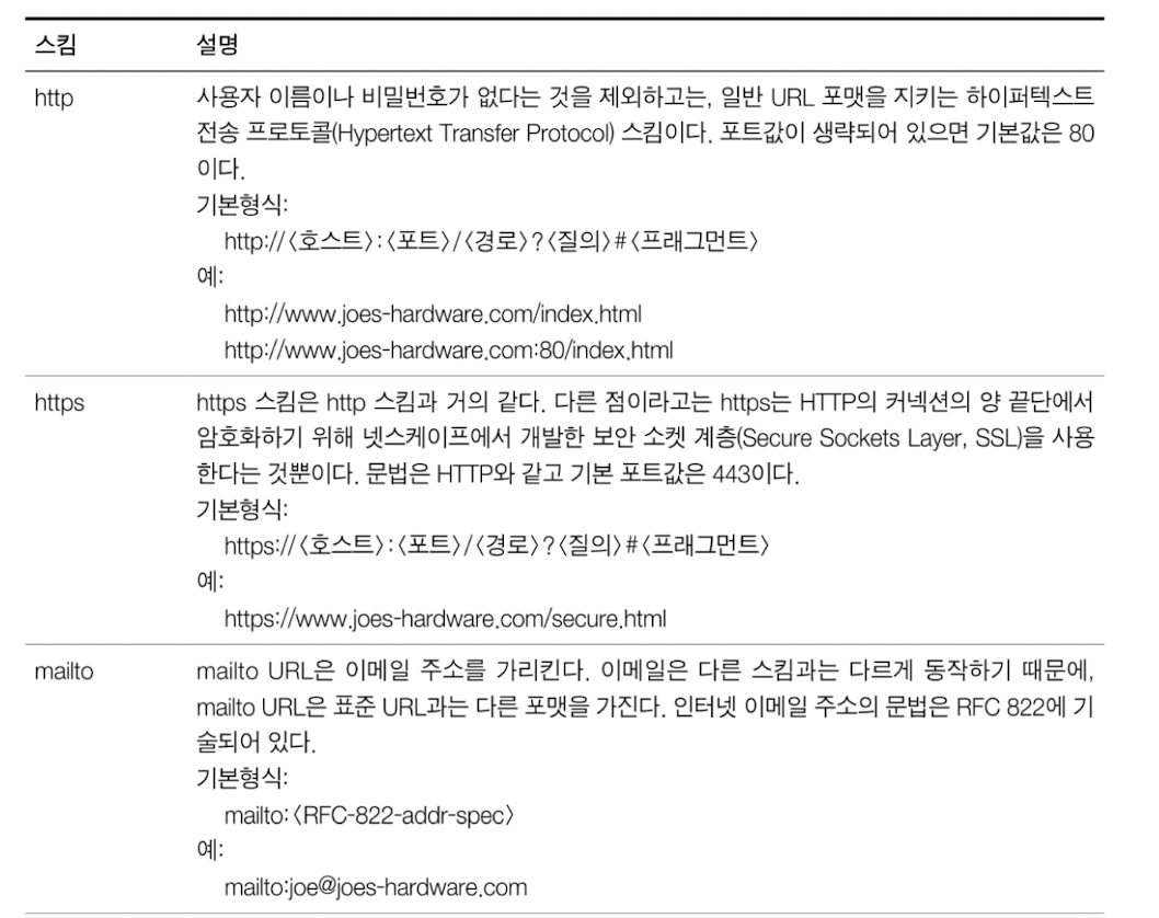 - URL의 첫 부분인 http는 URL의 스킴이다. 스킴은 웹 클라이언트가 리소스에 어떻게 접근하는지 알려준다. 이 경우에, URL이 HTTP프로토콜을 사용한다.