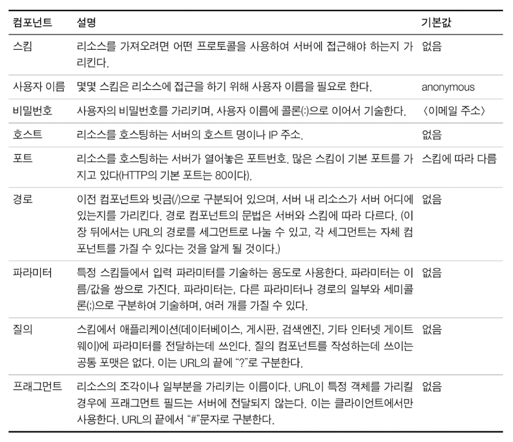 이 모든 컴포넌트를 가지는 URL은 거의 없다. URL의 가장 중요한 세 가지 컴포넌트는 스킴, 호스트, 경로다.